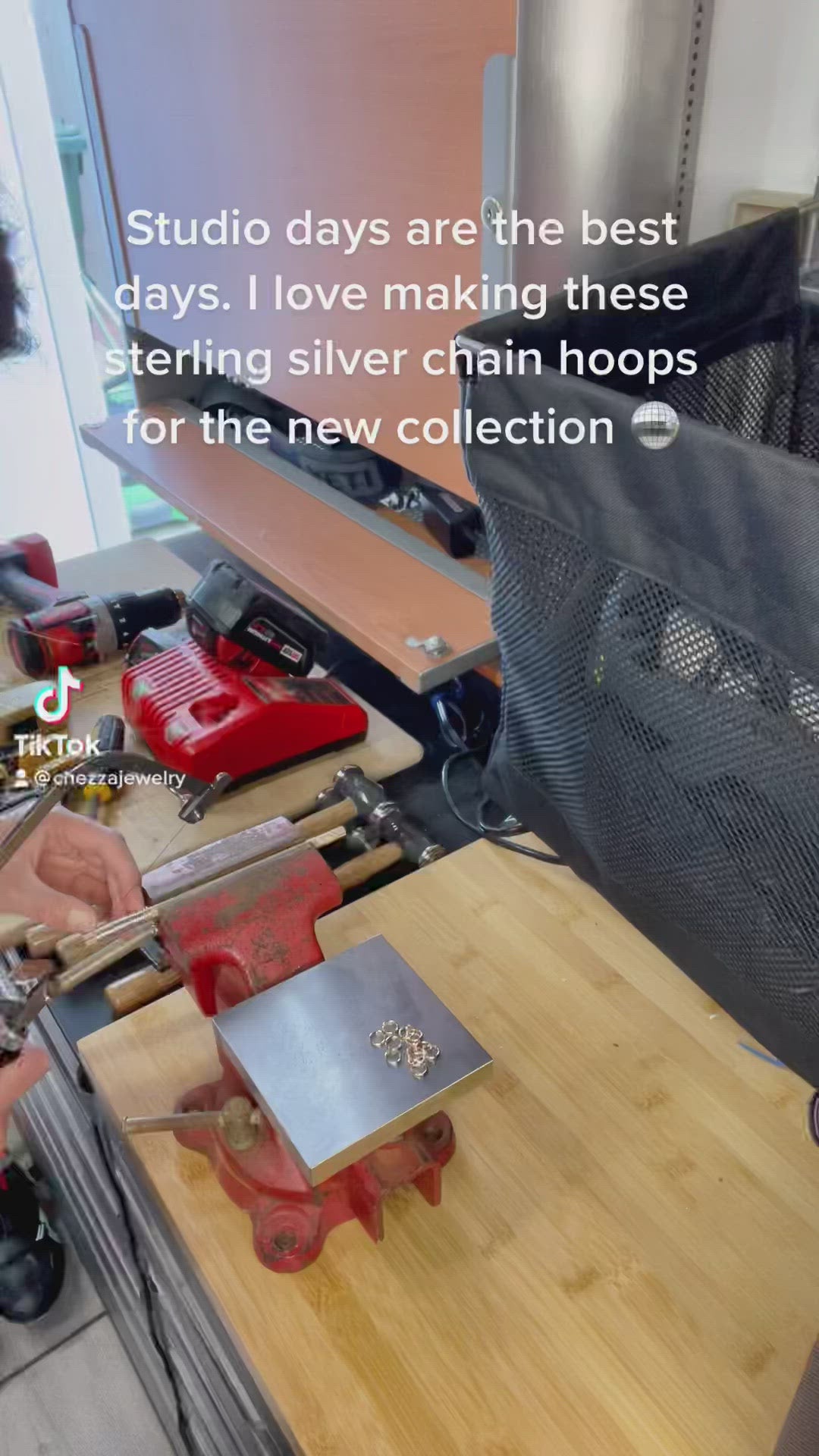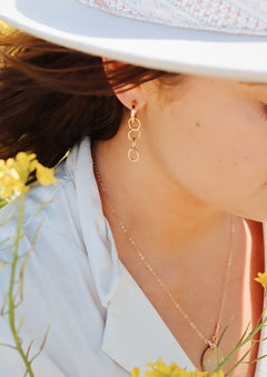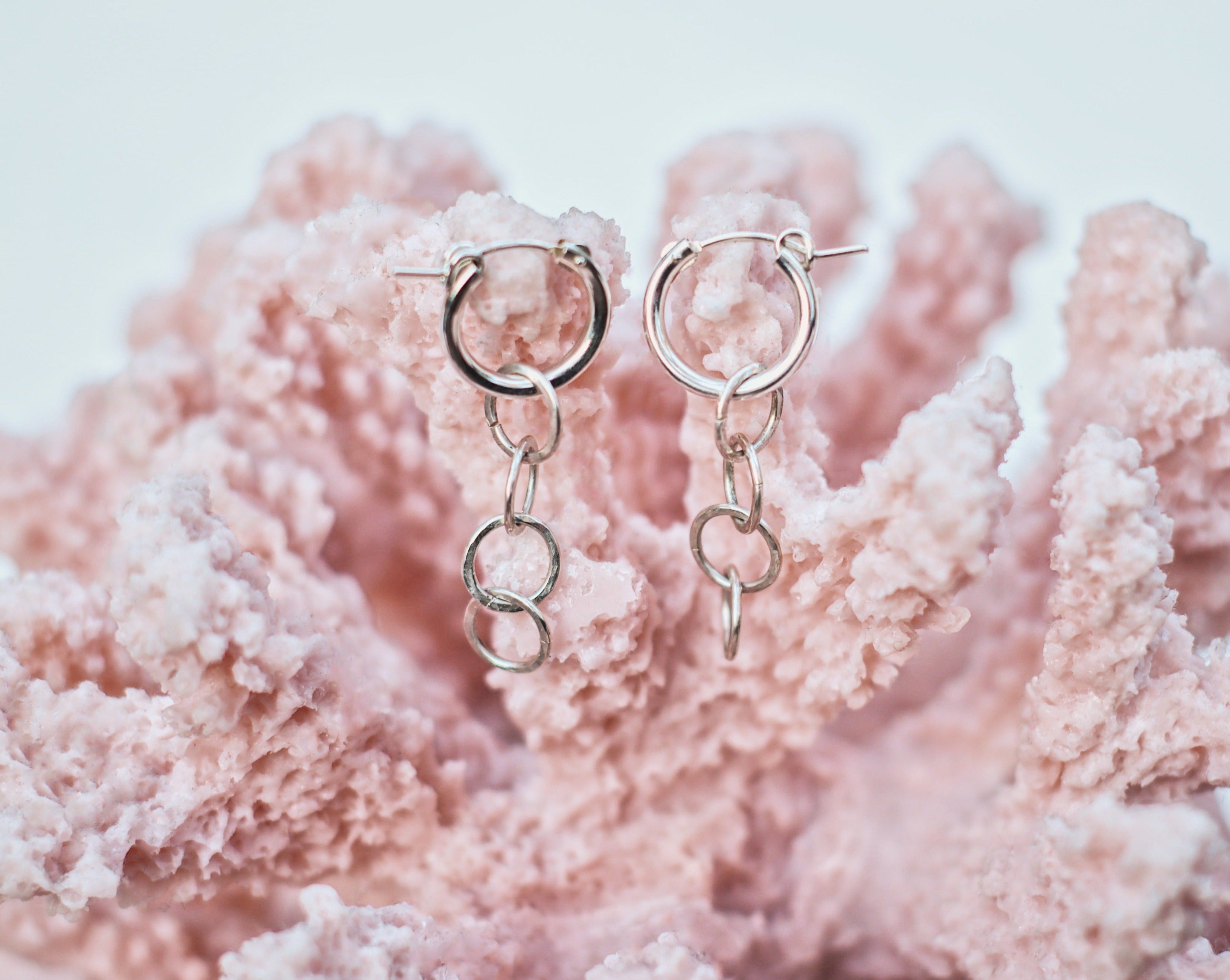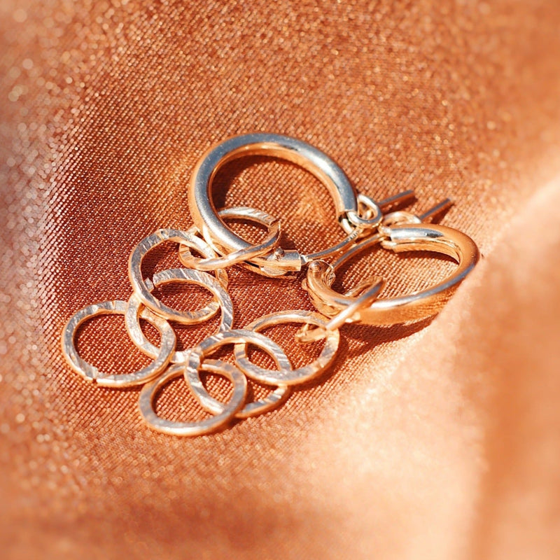 The chain hoops complete a look with their classic and clean style. The minimalist components go a long way as the hammered, handmade chain glimmers in the sunlight and catch everyone's eye.