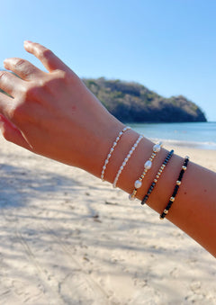 Black sparkly glass beads with a pop of gold. This bracelet is a great stacker piece.