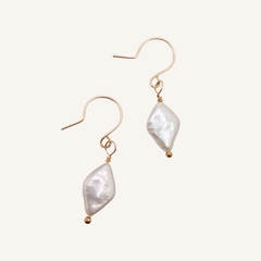 The diamond-shaped pearls for these earrings were carefully sourced for its' lustrous iridescence and unique beauty. The geometric shape of the pearls adds a modern touch while celebrating the organic beauty of pearls. This unique piece reminds me of the distinct beauty associated with golden hour that evolves from day to day.