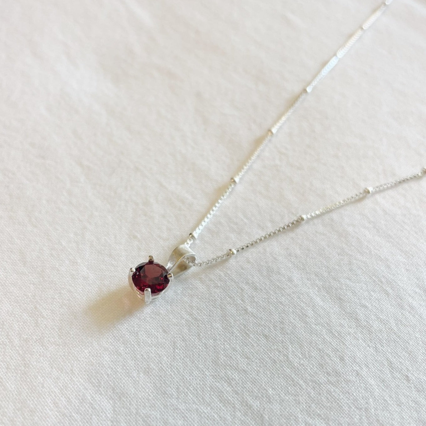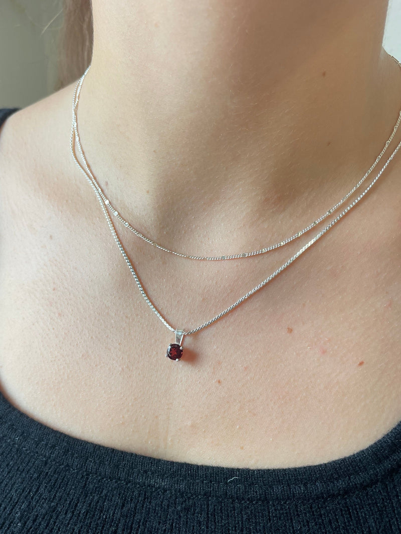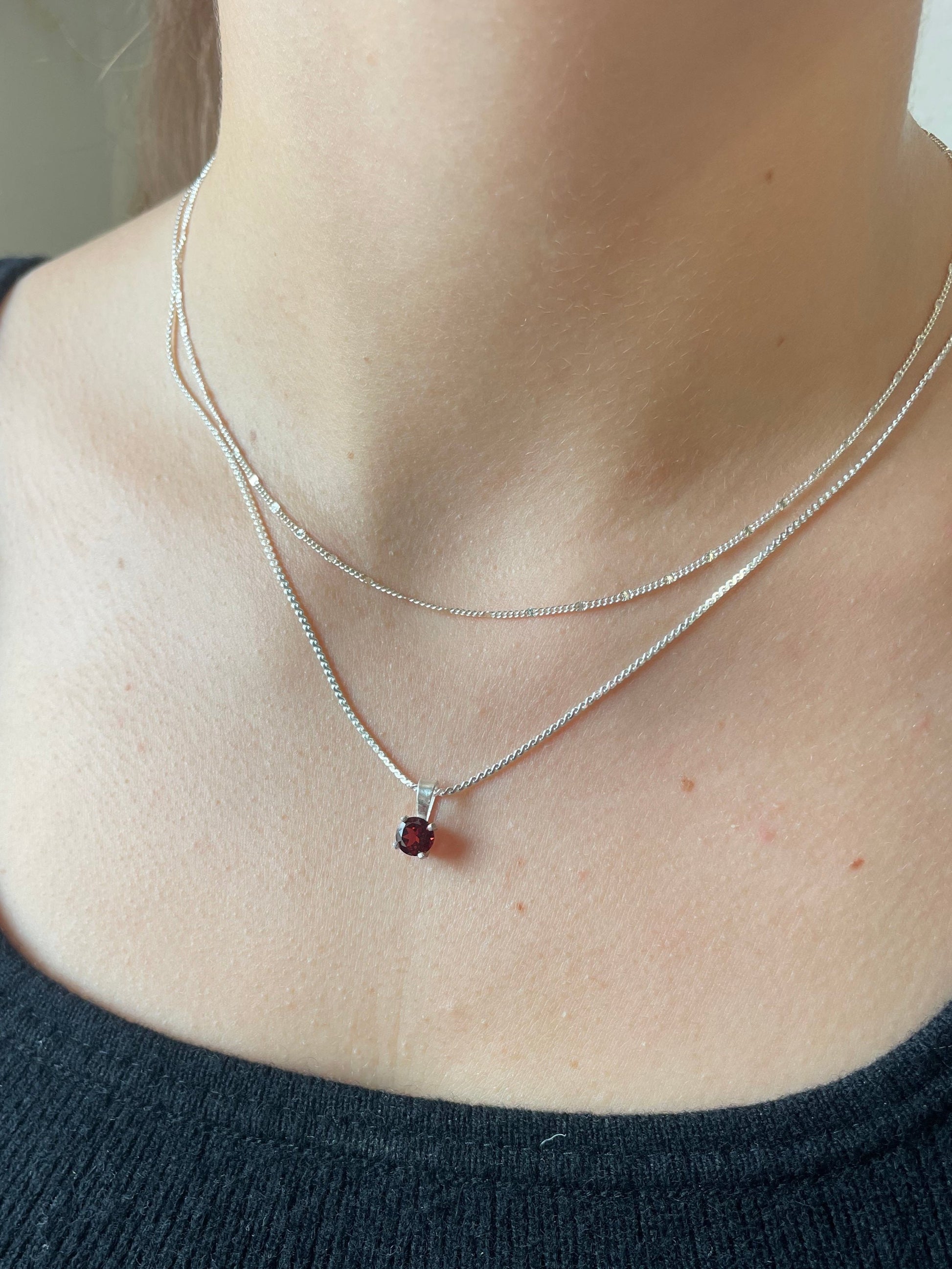 The Garnet necklace is a gorgeous dark red wine color, it's the birthstone for January. This stone is known to symbolize love, protection, and friendship.