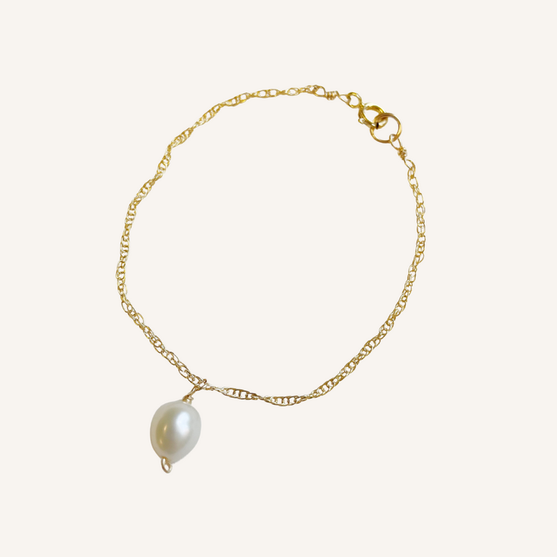 This Gold and White Pearl Bracelet is designed with a delicate Freshwater Pearl on a Gold-filled minimalist chain for a classic and elegant look.