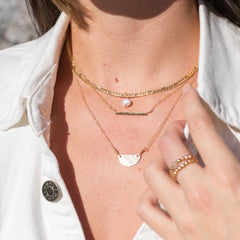 The Half Circle Necklace is a great stacking necklace or can be worn as a minimal statement piece. You'll also see the founder of Chezza Jewelry rocking this piece solo, it's one of her favorites!