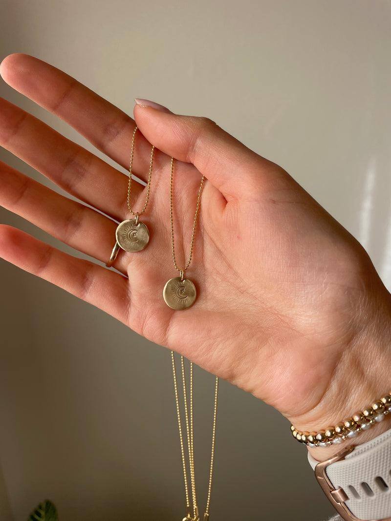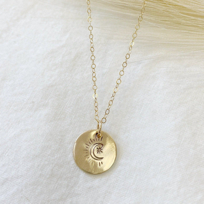 The Harvest Moon Necklace features a gorgeous shining moon and star symbol. Hand cut and stamped pendant.