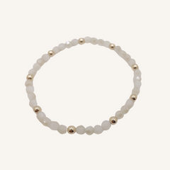 Sparkly white translucent glass beads with a pop of gold. This bracelet is a great stacker piece.
