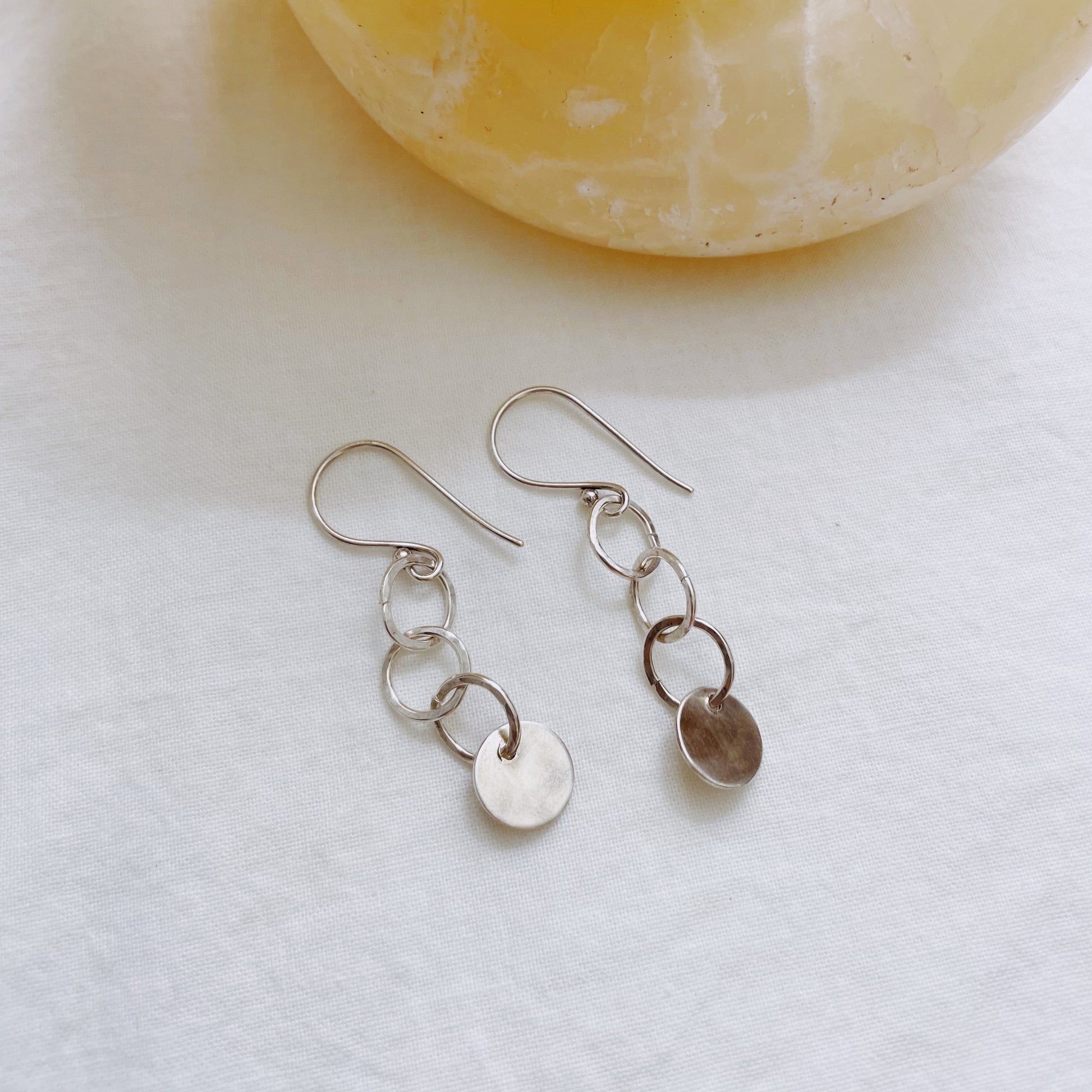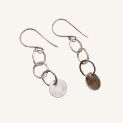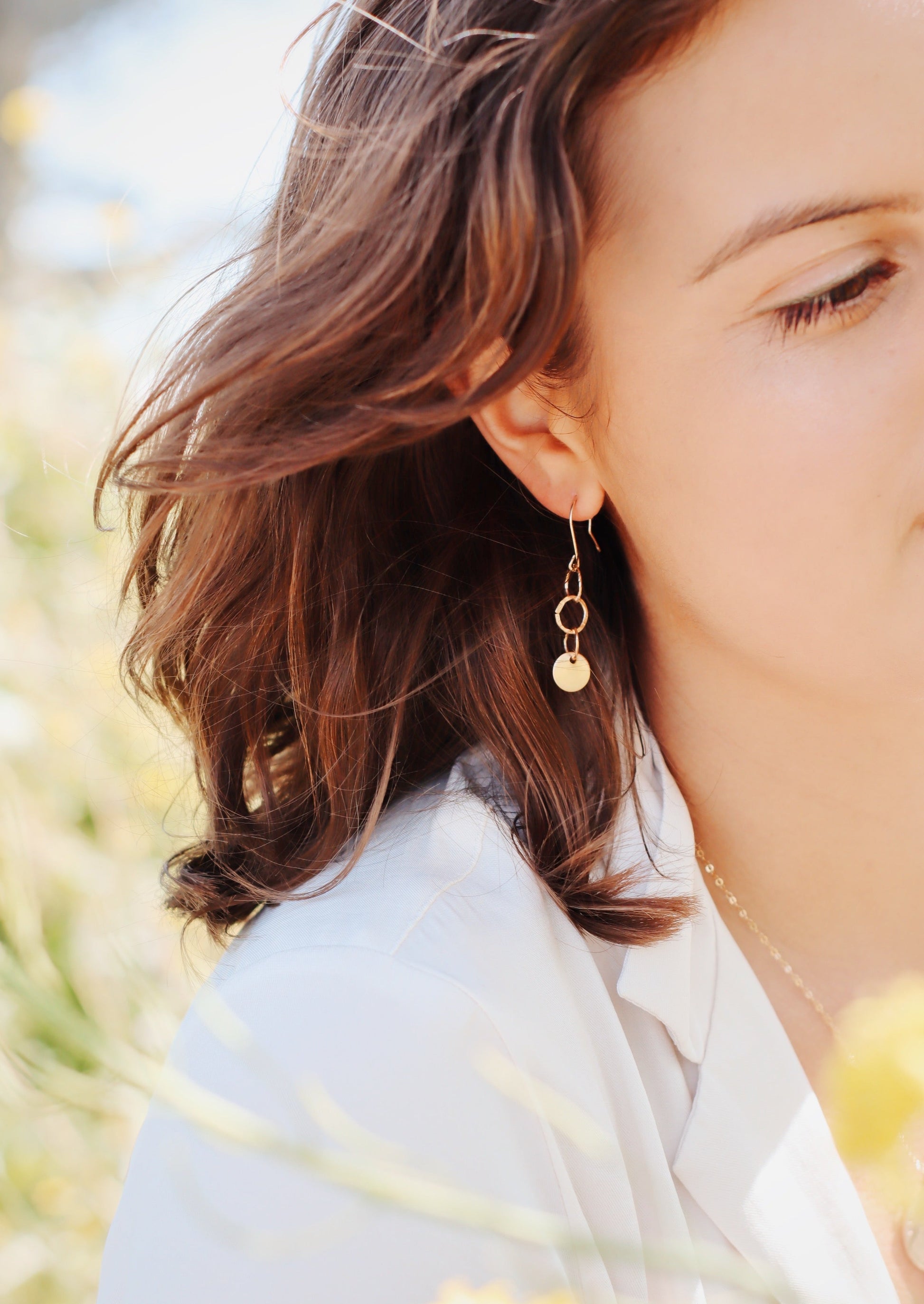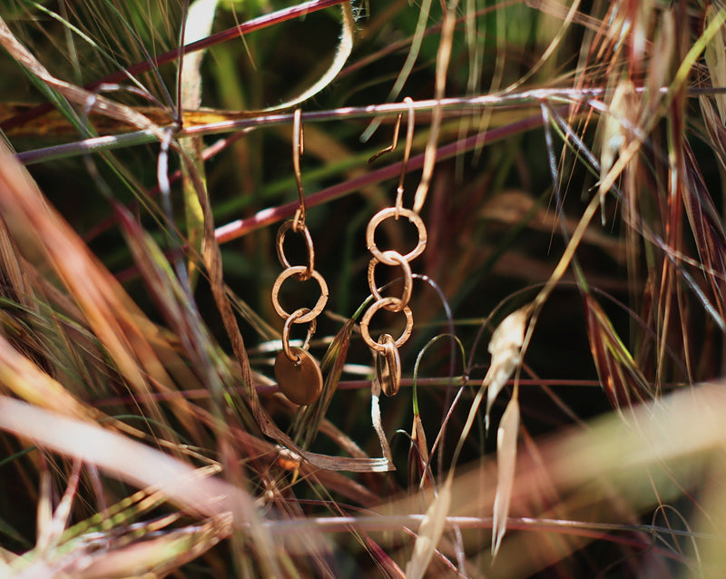 The Sun earrings brighten up the day with their shiny, gold-filled color and textured/hammered chain that glistens in the light. Cut, sawed, and hammered by hand.