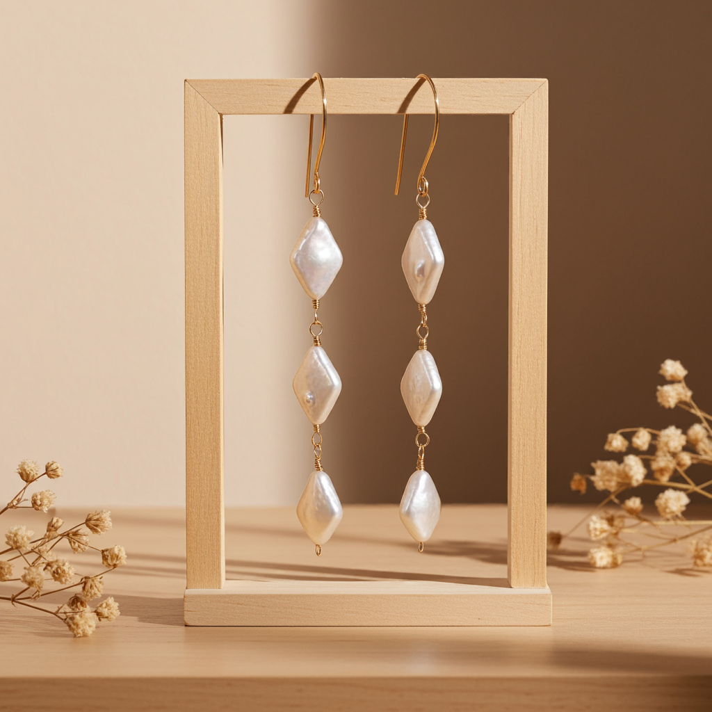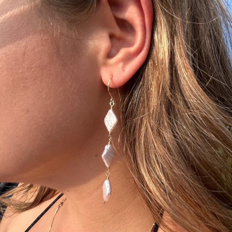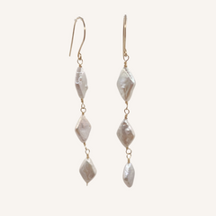 The triple diamond-shaped pearl earrings feature pearls that were carefully sourced for their lustrous iridescence and unique beauty. The geometric shape of the pearls adds a modern touch while celebrating the organic beauty of pearls.