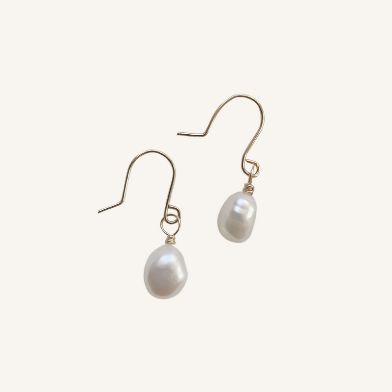 These elegant White Pearl Earrings are perfect for any occasion. Crafted in gold-filled metal, they feature a minimalist, classic look. Elongated and lightweight, the White Pearls will add effortless sophistication to your everyday look.